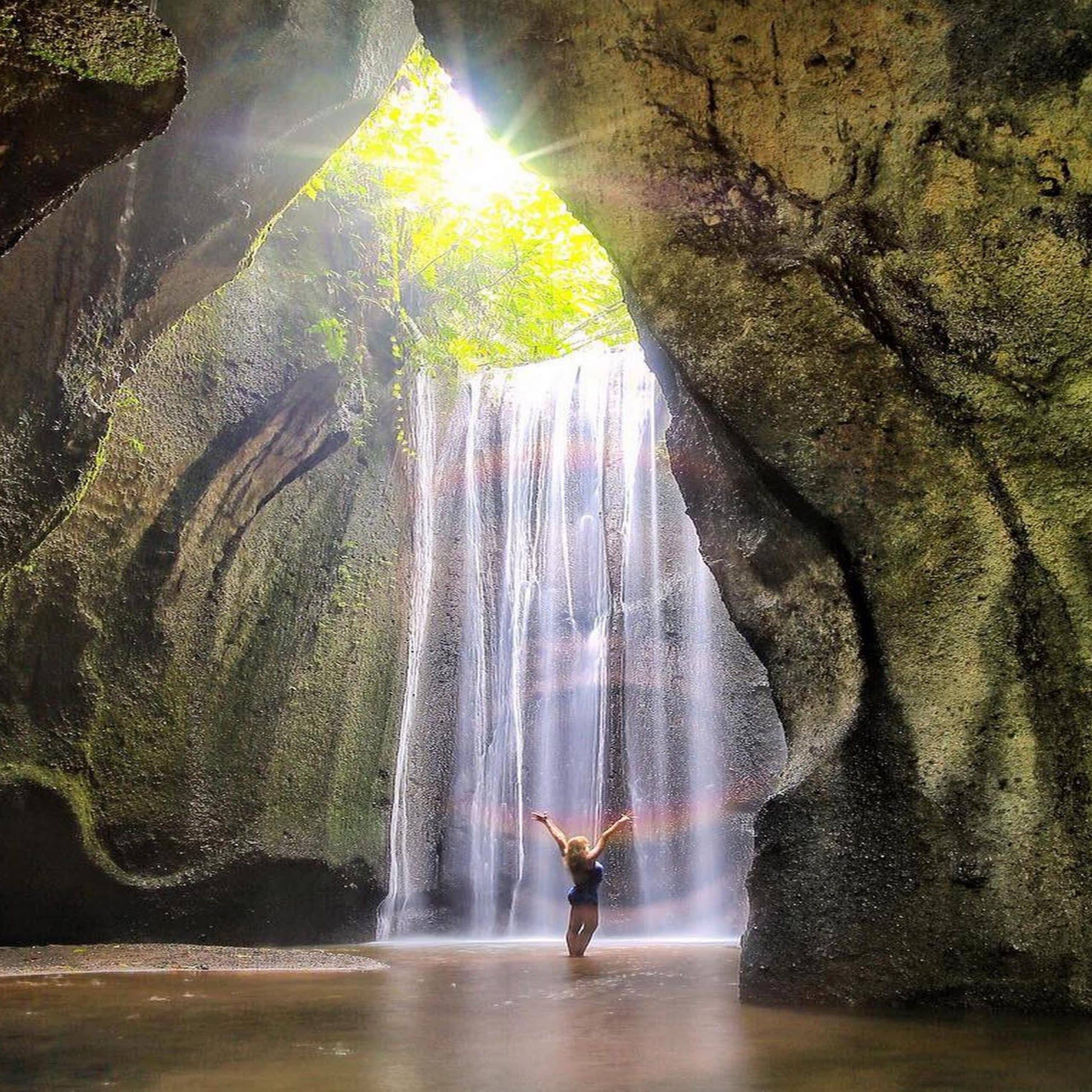 Next, you will drive around 45 minutes to get Tukad Cepung Waterfall. This waterfall is the most hidden waterfall in Bali. You cannot see it from any distance, except you go 10 meters from the waterfall because it is located inside the cave. To get there you need to walk along the jungle and some stairs to get the river. You will walk along the river with the high rock in between and you will see the most beautiful waterfall at the end.