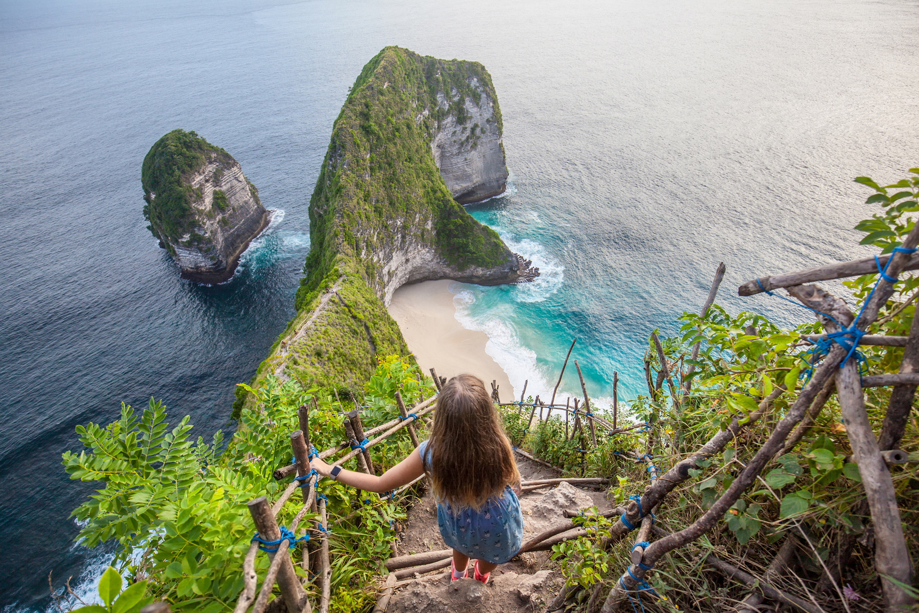 Family vacation lifestyle. Happy woman stand at viewpoint. Look at beautiful beach under high cliff. Travel destination in Bali. Popular place to visit on Nusa Penida island